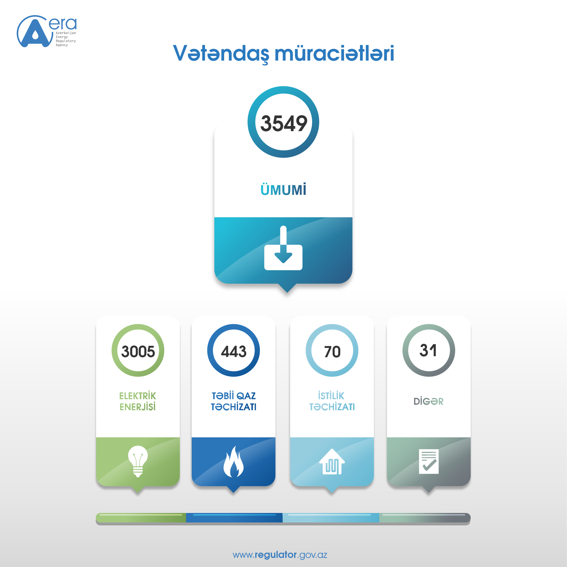 2026-cı ilin I rübü ərzində istehlakçıların hüquqlarının qorunması, abonentlərin elektrik və istilik enerjisi, təbii qazla təchizatı və digər məsələlərlə bağlı Enerji Məsələlərini Tənzimləmə Agentliyinə (EMTA) bilavasitə və Energetika Nazirliyindən 3549 müraciət daxil olub. Elektrik enerjisi təchizatı ilə bağlı 424-ü məlumat üçün olmaqla 3005 müraciət edilib. Təbii qaz təchizatı ilə bağlı 30-u məlumat xarakterli olmaqla 443 müraciət olunub. İstilik təchizatı ilə bağlı 5-i məlumat üçün olmaqla 70 müraciət edilib. Digər məsələlərlə bağlı isə 5-i məlumat üçün olmaqla 31 müraciət göndərilib.